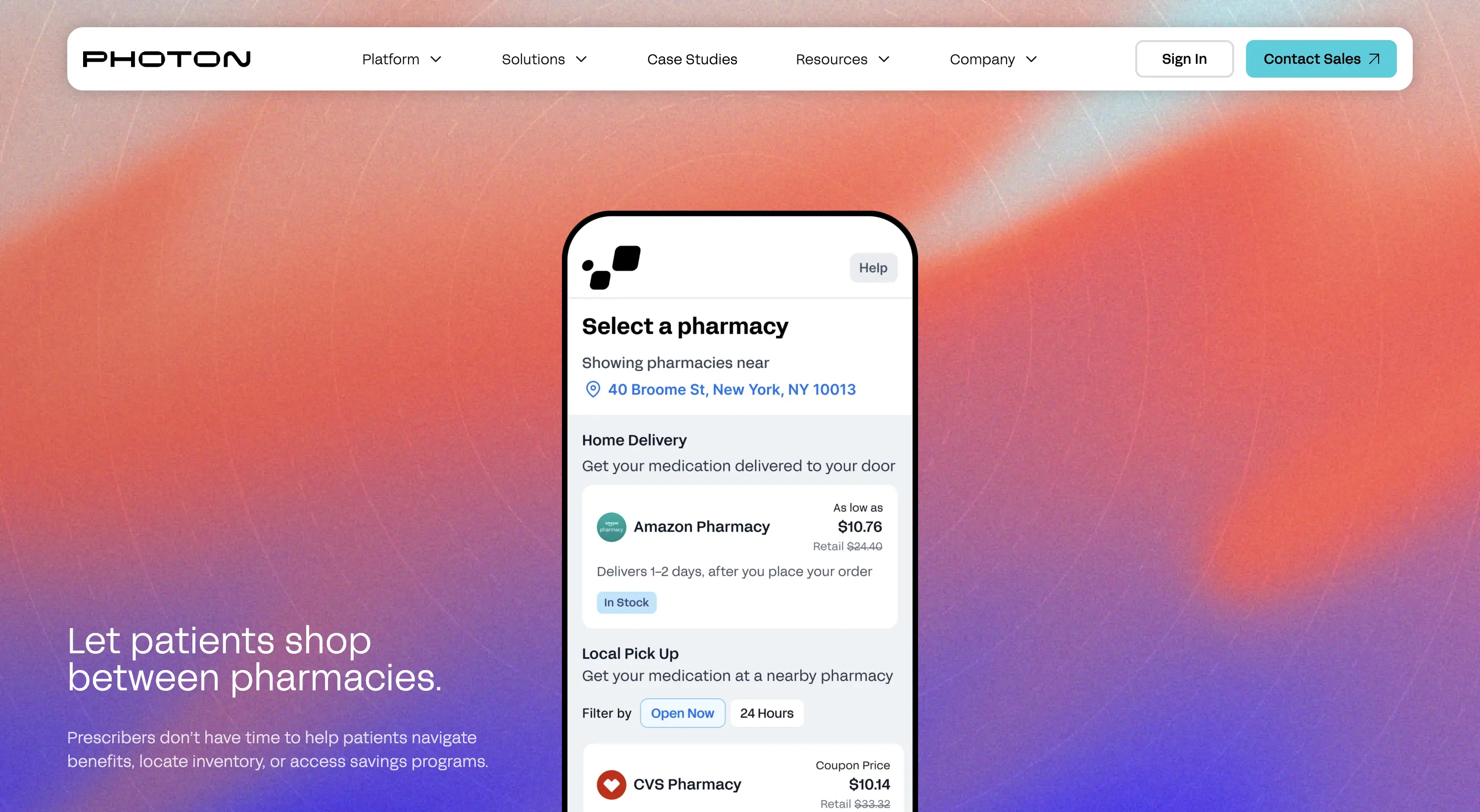 To date, I've designed for partnerships with the biggest companies in healthcare, from the leading mail order pharmacies, to discount card companies, to pharma companies, and health tech platforms to make Photon's prescription marketplace the new default way patients get their prescription.